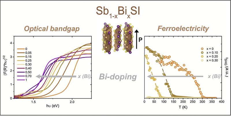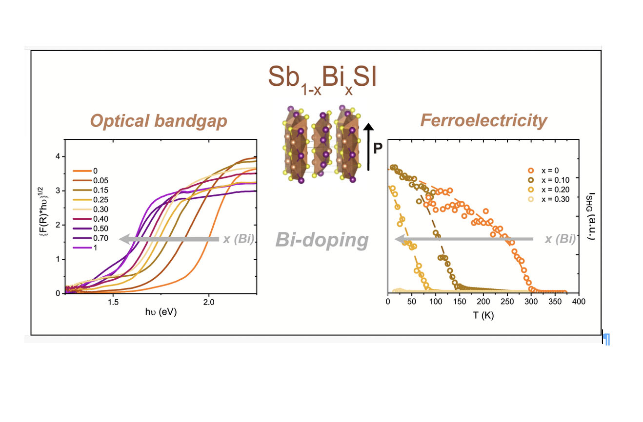 A new paper by the von Rohr group reports how substituting bismuth for antimony in the van der Waals chalcohalide SbSI allows continuous tuning of both optical and ferroelectric properties. The study shows that the bandgap decreases to about 1.5 eV with increasing Bi content — an energy well suited for solar absorption — while ferroelectricity is progressively suppressed, as revealed by the disappearance of soft-phonon modes and second-harmonic generation signals. First-principles calculations attribute this behavior to a reduced lone-pair activity on the Sb/Bi site, which destabilizes the polar ground state.